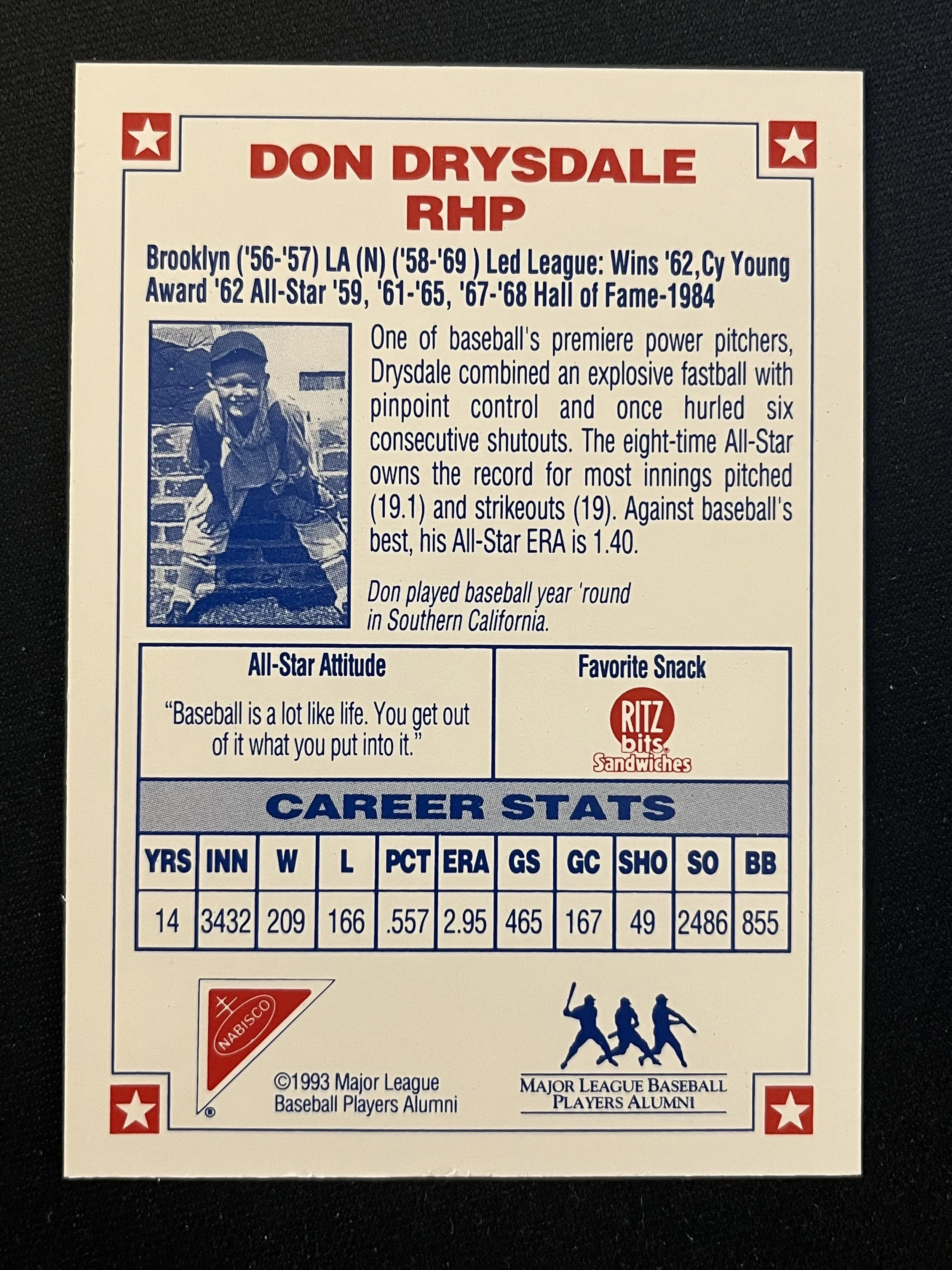 According to Sports Collector’s Daily, the promotion generated 112,096 orders for 238,773 cards. Don Drysdale had signed approximately 25,000 cards just before he died from a heart attack in the summer of 1993 making his card a bit tougher to find. That means the other 5 players signed over 42,000 each on average.