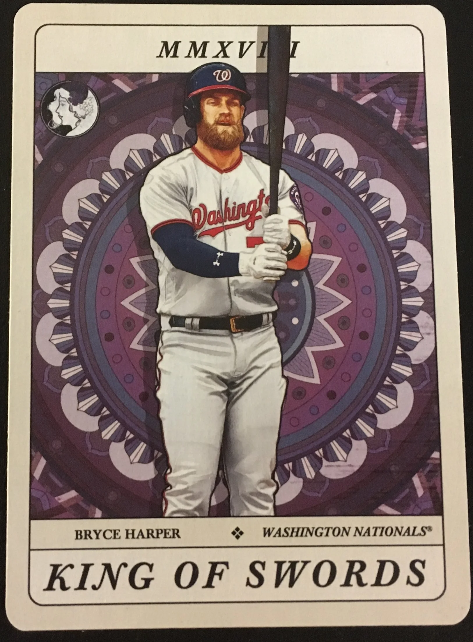In addition to the base set, there are couple different insert sets which in my opinion are the highlight of this product. The Gypsy Queen inserts seem to be unique in comparison to some of the other Topps releases. This year we find the "tall boy" Fortune Teller set which features a 2018 player prediction on the back of each of the 20 cards. There is also a 22 card "Tarot of the Diamond" set which is intended to look like a fortune teller's tarot card set. I pulled a Bryce Harper out of my Blaster box, and it might be my favorite card in the break!