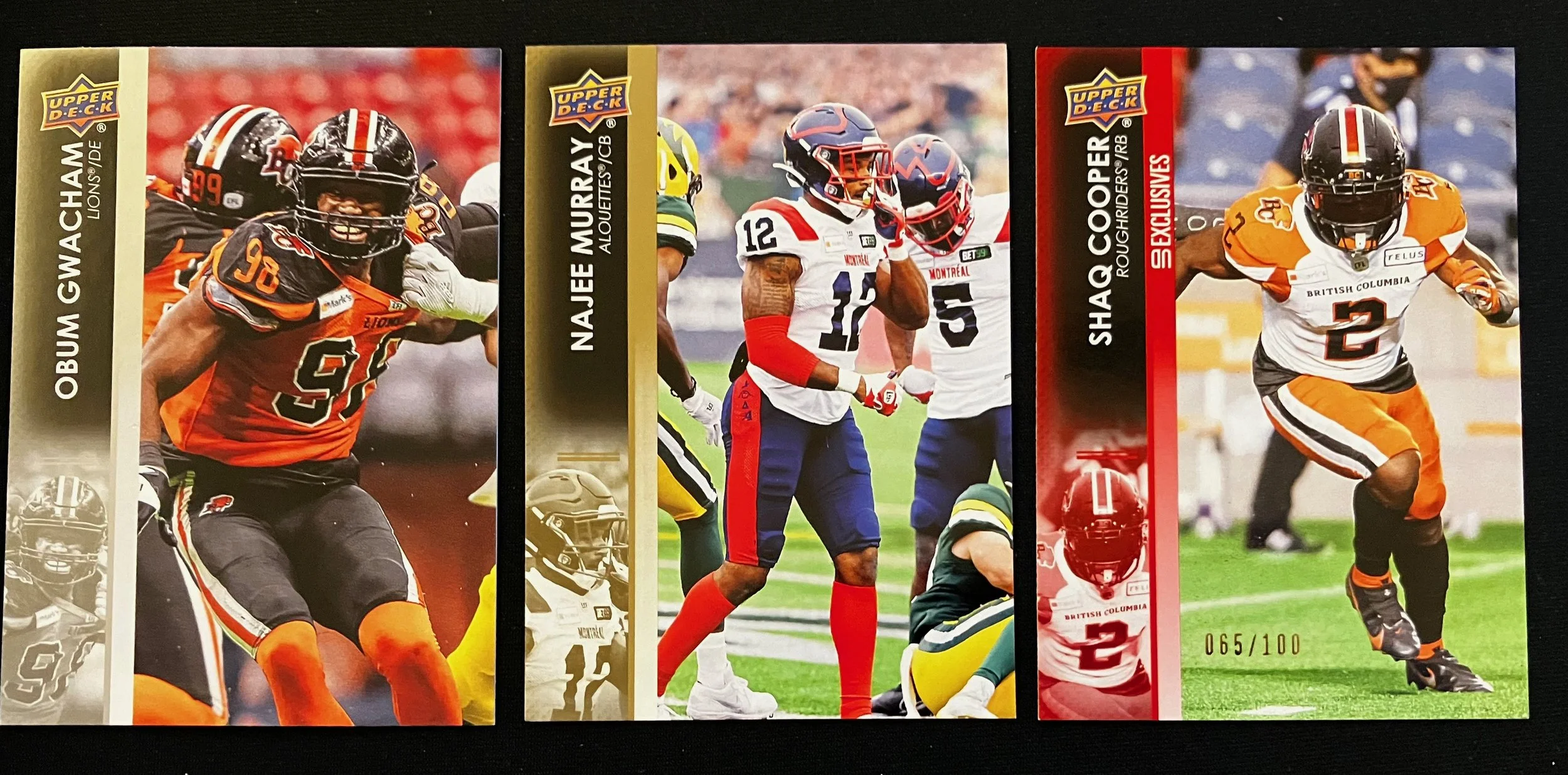2022 Upper Deck CFL Base card, Gold Parallel, and Red Exclusives Parallel