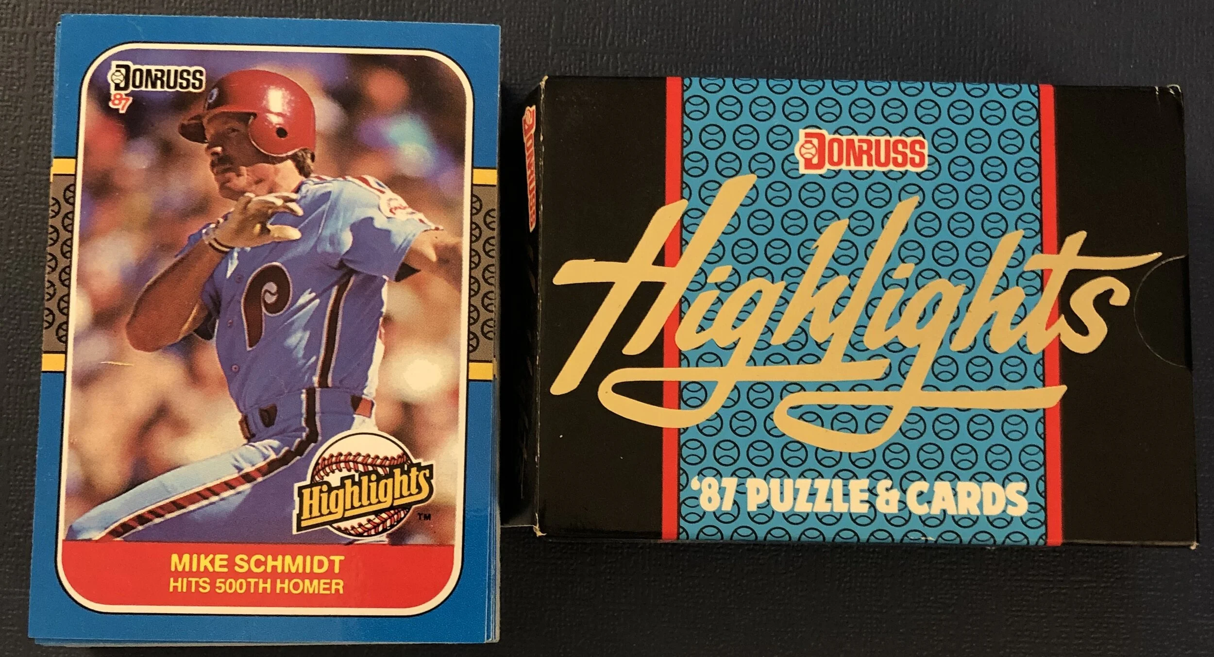 The final version of the Highlights set as a stand alone box set was 1987. Donruss had a formula for these sets and they stuck to it in 1987. Once again, the set contained 56 cards and a mini-puzzle. Like the previous two years, the basic flagship design was used with a color change on the border and a glossy finish to set it apart. For this set, a light blue border replaced the black border of the flagship release. Also, the team logo was replaced with the Highlights logo which was consistent with the first two editions of the set.